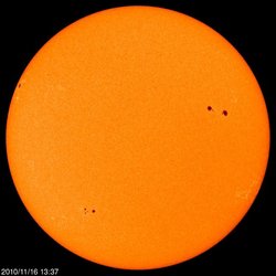 The Sun, as seen on Thursday, November 18, 2010 from NASA's SOHO Extreme Ultraviolet Imaging Telescope. This MDI (Michelson Doppler Imager) image was taken in the continuum near the Ni I 6768 Angstrom line. The most prominent features are the sunspots. This is very much how the Sun looks in the visible range of the spectrum.