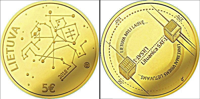 The face of the gold coin features the Lithuanian coat of arms as a star constellation, with LituanicaSAT-1 and LitSAT-1 on the other side.