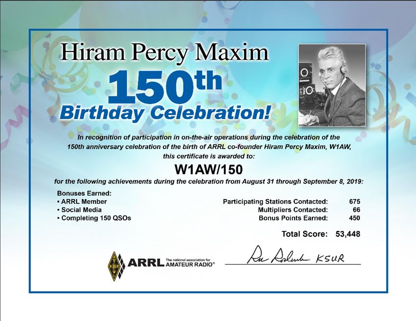 Hiram Percy Maxim Birthday Celebration Results and Certificates Now Available