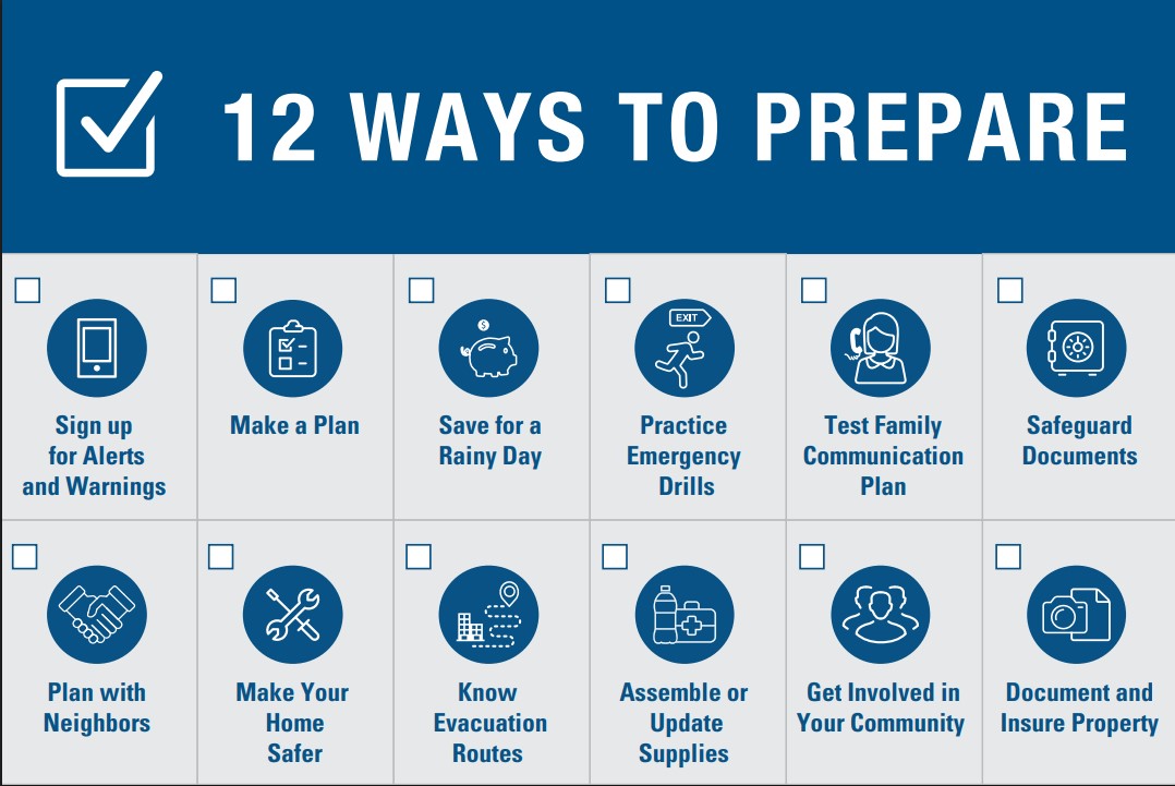 ARES works closely with the Federal Emergency Management Agency (FEMA), which has shared this checklist of 12 ways to prepare [PDF]: