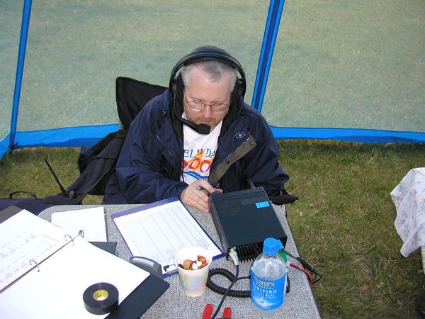 This is my second year with a General class license and my first attempt at Field Day as a single operator portable station. My loyal companion, (my wife Arlene) and I set up my station at Windmill State Recreation Area, about 40 miles from home. It was an extremely cool day for Nebraska in June. The rig is an ICOM 706MKIIg through an MFJ-969 tuner all powered by a marine battery. The first antenna we put up was nothing more than a simple 80 meter dipole fed with ladder line. Couldn't get it to tune up to save my soul. At this point field day was in its second hour and I hadn't made a single contact. Down comes the 80 meter dipole to be replaced with a previously tried 40-20-10 multi dipole. Hurray, got on the air. I figured the problem out on Monday morning after Field Day. The tuner requires a jumper to connect the internal 4:1 balun. I thought the jumper was internal to the tuner. The second antenna I put up was fed with coax. Lesson learned. Never overlook the simplest things. I had never used the tuner with a balanced feedline. We hung it up about midnight local time. I was kind of sad to see it end. Looking forward to Field Day 2005 and trying that 80 meter dipole out.