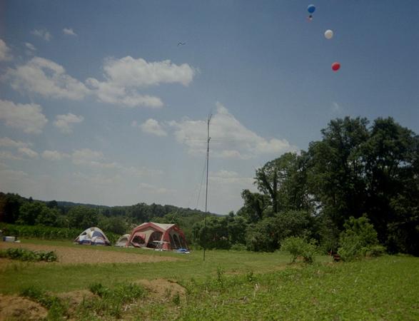 The next thing to do was to erect my special antenna. This was the secret weapon. A helium balloon supported vertical antenna. I always like building an antenna and thought it would be fun to make a temporary unit that could be tossed at the end if desired. Yep Red, White and Blue with Old Glory being displayed!