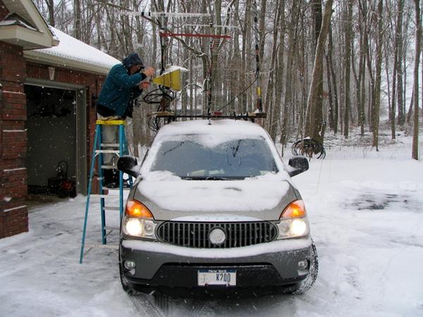 Sunday was altogether different as we started with bright sunshine and 13F. The Q'came quickly. W2TAU in the front seat position could not write fast enough at times! Extra crazy was that in FN12 and FN03 we did not use our usual excellent locations. We stopped at N2KXS's to work her and WO2P, have cookies and cocoa, a laser Q and to warm up. But after TAU went in the house with the laser, all hell broke loose and I cranked out Q's with virtually every ham in Rochester as they just kept on calling. Her driveway is not the best looking spot but it sure played well.