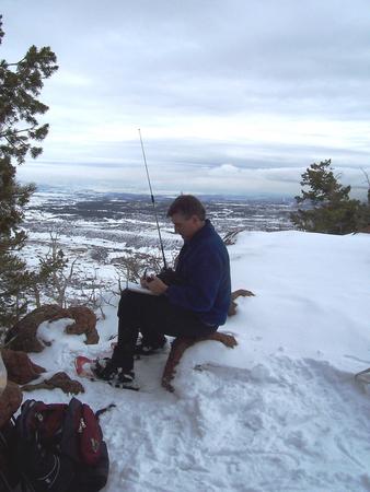 We snowshoed up the trail slogging through large drifts and ultimately made it to the summit. It was very cold at the top, so it was difficult to operate the radios. I made about 25 contacts and then headed back down. Station: FT-817 and an Alinco 222 MHz FM HT. I didn't bother to set up the Yagi antennas and just worked off a BNC vertical. At first, I was thinking I wouldn't work anyone outside my grid (DM79) but I managed to work stations in the usual adjacent grids. No significant propagation to report.