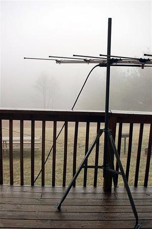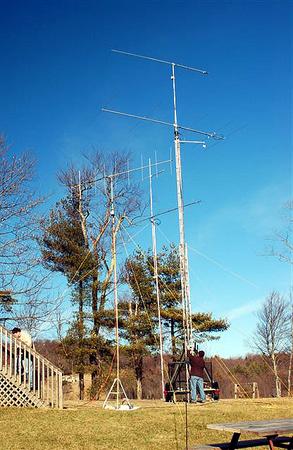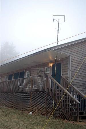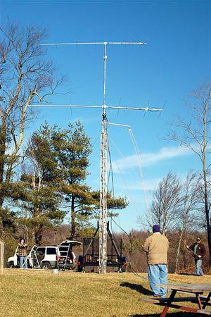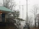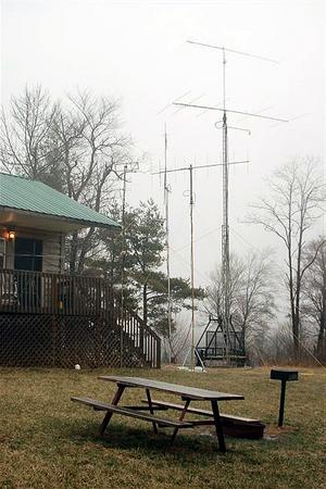 The weather near Fancy Gap is always unpredictable, and this year was no different. Here's the mixed bag: Friday was nice for setup, but was cold and windy. Gusts after sunset reached the 40-50 mph range. Saturday and more setup brought another nice day with cold temps. and wind. Sleet and freezing rain moved in Sunday morning and lasted most of the day, coating the antennas with a thin layer of ice, and creating hazardous road conditions. Due to the ice buildup, we set up some backup antennas under the overhang of the cabin porch which allowed us to continue operating on 2m SSB. Sunday night about midnight brought warmer temps. which thawed the ice, making breakdown