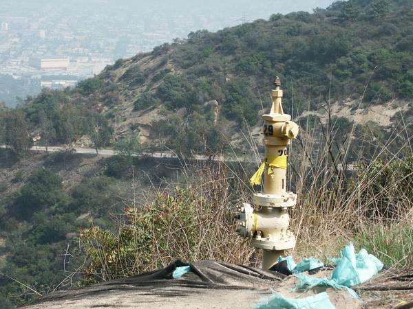 My plan was to duct tape the mast to this fire hydrant. It sits near the shady side of a large water tank where I would be out of the wind and sun. Oh well. Maybe next year. Had lots of fun working from the home station. Jim, Burbank, CA -- ND6P