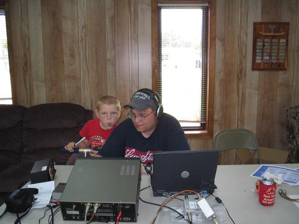 Benny showed back up in the morning and found 15 meters alive. He churned out points on that band while Wade and I moved back to 20 meters on the OCF. By the end of the day, we had in the vicinity of 900 CW QSOs and over 200 phone QSOs. This was a (recent memory) record for our club that can be attributed to multiple CW stations. (All the more amazing given the sunspot cycle). Who says CW is dead?Considering the atmosphere was more social than competitive, I'd say FD2007 was a resounding success for K5ARC! The end of activities saw a brief downpour of rain as the crew took down the antennas. I had to get my son (Phoenix Roberts, pictured on the scooter) to his mom's house that afternoon so I was fortunate enough to be spared the storm!