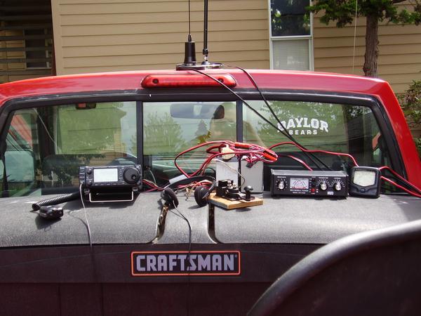 I did have the benefit this year that I was not outside in over 100 degree temperatures but I was outside in the SUN... I got a nice sunburn as this time the pickup was not under a covered parking slot. I had a tarp available in case we had any rain as we occasionally do here in Oregon. That tarp came in handy as we did have some showers in the afternoon and early evening where I was able to keep operating with the tarp over my station in the bed of the pickup. I had awesome plans of having a diapole or an inverted vee that could be used from the pickup and I also had plans to get a used laptop that I could use for mobile hf, vhf, and uhf packet operation but alas money and time ran out so I used basically the same antenna setup I used last year and of course I had no mobile packet operations.