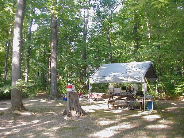 My operation this year featured 3 generations of transceivers. In the all solid state department was the Drake TR-7, hybrid was represented by an FT-101 and the Hallicrafters SR-160 did it's part as an all fire bottle rig and made great noises on 75. My operation also featured 3 antennas and 3 tuners, making easy band changes possible without a lot of retuning. In addition, there is a switching arrangement allowing any of the three rigs to connect to any of the three antennas. This is valuable since the orientation of antennas allows for directional selection. The antennas this year were a G5RV, an original Windom and an 80 meter dipole. Owing to the huge trees in our community park, the lowest antenna was at the 30 foot level. The trees were so thick that the feedlines disappeared, appearing to visitors as real skyhooks. I had many questions about that.