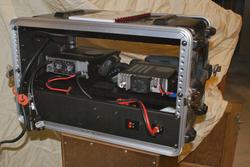 on a table, pop the front and back, hookup power and antenna and you are good to go. Originally I had planned to have batteries in the case but decided against it because: (1) So far in every instance I have been deployed we had AC or DC power available; (2) If I need to run off external batteries the case is wired so that I can plug in my battery pack or even clip to a car battery; and (3) No battery means less weight. The blank space at the left contains wiring for my Yaesu FT 100D if I need to go HF. My case