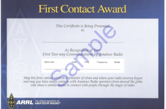 This handsome certificate commemorates that special first on-the-air contact. It comes completed with the contact information that you provide in the form below and has a place for you to sign and date when presenting the award.