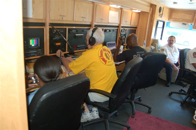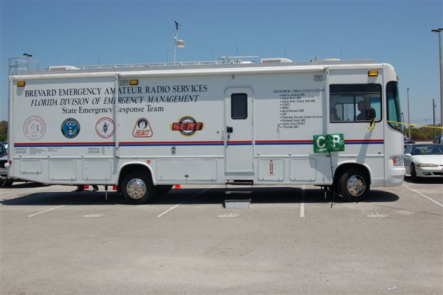 John Weatherly, AB4ET, and Clayton Bennett, KA4NHW, manned a 2 meter station in a shelter set up by the American Red Cross. Additionally, the Brevard Emergency Amateur Radio Services (BEARS) donated the use of their mobile command center to public safety agencies. The command vehicle, dubbed BEARS-I, was obtained through a $100,000 grant from the State of Florida. The interior was designed and built by a group of Amateur Radio operators from local Brevard County clubs that are members of BEARS. BEARS-I is outfitted with Brevard County 800 MHz public safety radios and amateur equipment.