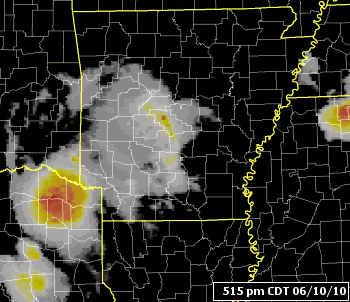 ![The system brought two rounds of showers and thunderstorms from southwest into central sections of the state during the afternoon and evening hours. In the picture: The satellite showed one area of clouds and precipitation from southwest into central Arkansas during the afternoon of 06/10/2010. This was followed closely by an MCS (Mesoscale Convective System, or large cluster of showers and thunderstorms) by evening. [Map courtesy of the National Weather Service, Little Rock]](/img/130x97/exact/News/NWSmap2.gif)