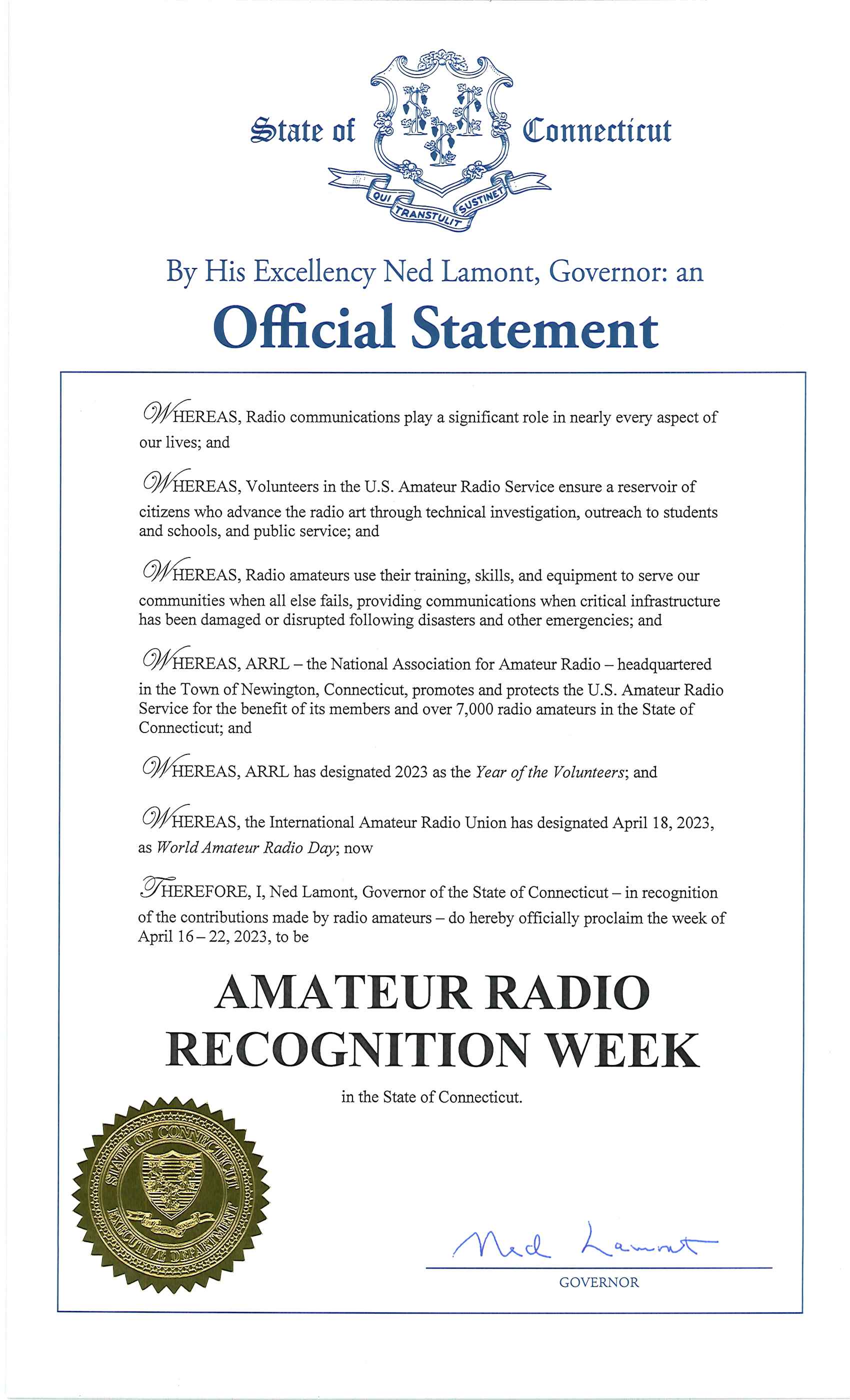 Connecticut Governor Ned Lamont has released an official statement, designating April 16 – 22, 2023, as Amateur Radio Recognition Week. The proclamation coincides with World Amateur Radio Day (WARD), which is held annually on April 18.