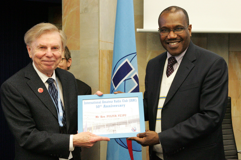 ![J. Kenneth Pulfer, VE3PU (left) and ITU Secretary General Dr Hamadoun Touré, HB9EHT, at the annual banquet of the International Amateur Radio Club in February 2012. Pulfer passed away on March 31. [Photo courtesy of the ITU]](/img/130x97/exact/News/VE3PU.jpg)