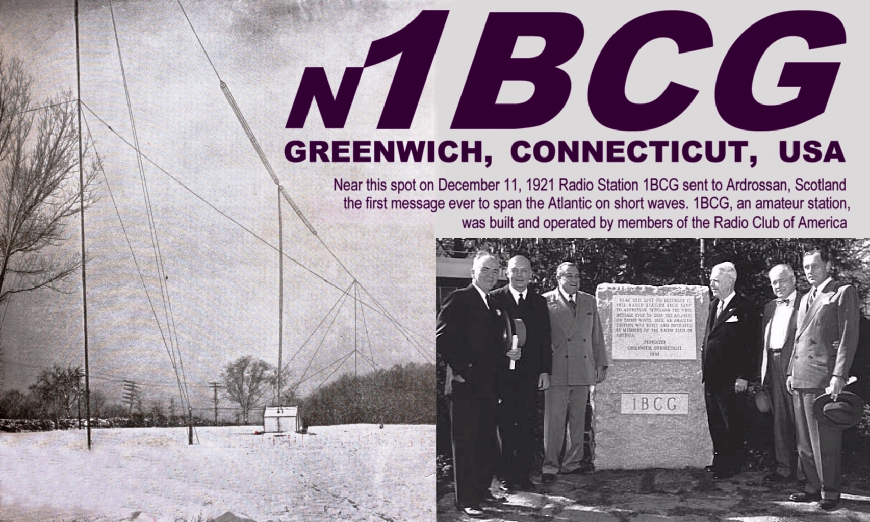 On December 11, 1921, reception in Ardrossan, Scotland, of a radio signal transmitted from an RCA test station — located in a small shack on the property of Minton Cronkhite, 1BCG, on the corner of Clapboard Ridge Road and North Street in Greenwich — helped to usher in the age of global communication. The special event will use N1BCG, the call sign of Clark Burgard of Greenwich, who obtained that call sign to commemorate this bit of radio history. Burgard was instrumental in making arrangements for the event.