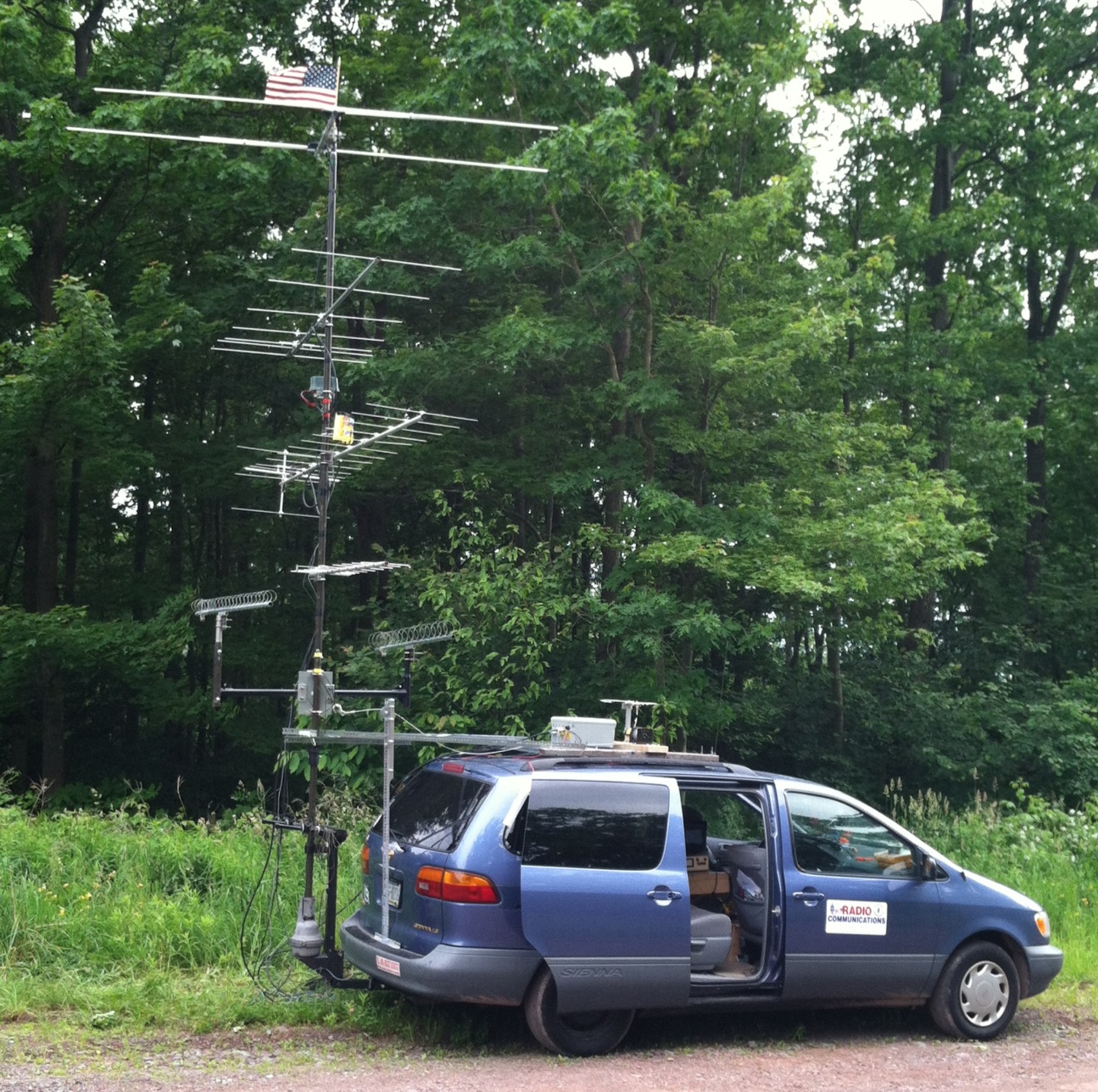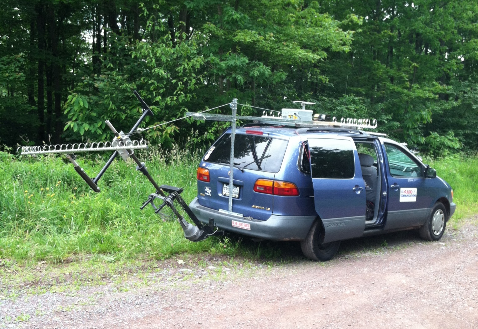 Setting up antennas when you're alone is always difficult. I managed to find a pretty effective way of doing it though. You can see in the pics, the bike rack mount on the van. I had a rotor plate welded to it and then mounted guide bars from the roof rack for a second attachment point. The mast leans over, but during testing, I found that it was impossible to hold up by myself. I am now the first on my block to have a winch mounted to the roof of my van. It raises and lowers the mast quite nicely. My wife made me take it off when I'm not operating a contest. The box on the roof is the amps/preamps for 903 and 1296.
