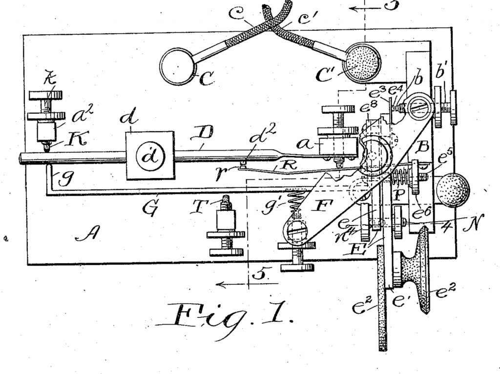 Mecograph was owned by Bellows who upon seeing the success of the Vibroplex, built on Martin’s idea but employed the release mechanism of Coffe’s patent and received a patent on a new bug (see Figure 6).