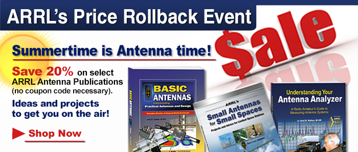 Summertime is antenna time! To celebrate, ARRL is rolling back prices on some of the hottest antenna publications in Amateur Radio. Save 20 percent on select ARRL antenna-themed publications when you order online through July 31, 2015. No coupon code is necessary to receive the savings, and discounted titles may be combined with one coupon code offer. For a complete list of discounted publications, visit ARRL’s “Antenna Books Price Rollback” page online.