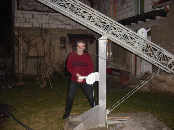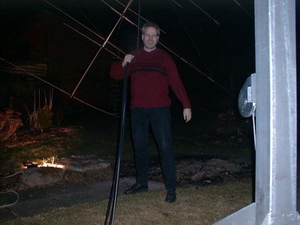 during the preset phase to bring up this kind of experimental wire inverted vee G5RV antenna. We finished the outside work in a record time, 2 hours before the contest 2003 starts. It was a night shift work with a powerful 500 watt lamp. Frank did some digital pictures during the outdoor working on my "antenna farm".. as well. Thanks Frank. Please find attached some contest impression photographs.