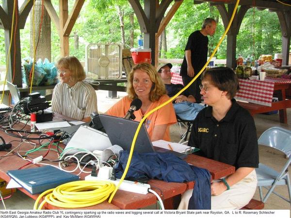 The North East Georgia Amateur Radio Club had a very successful and rewarding Field Day this year. We ran a 3A operation with GOTA station (KT4Q) and managed to operate all radios continuously for the 24 hours. We operated this year from Victoria Bryant State Park near Royston, Georgia. We had over 20 participants and visitors which is a nice showing given the current membership of our club is slightly over 10. We managed to hang 4 dipoles and 2 verticals for a very simple and quick operating setup. We came to believe that not only did we have significant radio and operating skills, we have culinary experts. If you went away hungry you missed a great opportunity. We managed exactly 1000 contacts nearly doubling our output from last year.