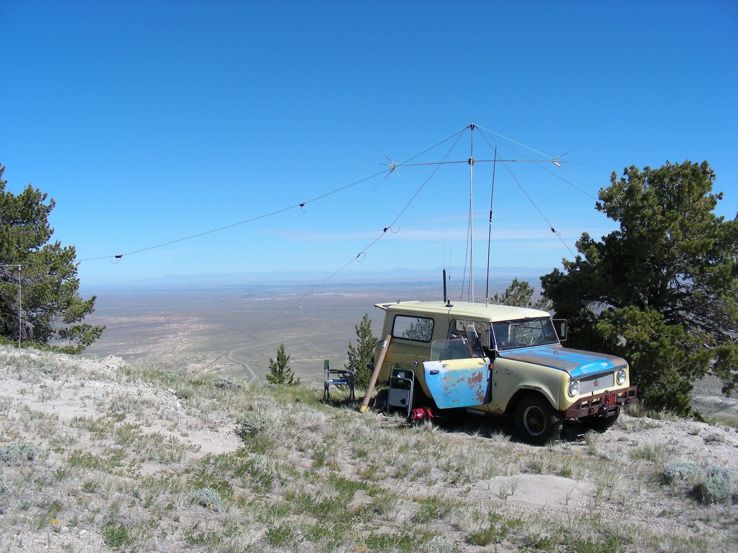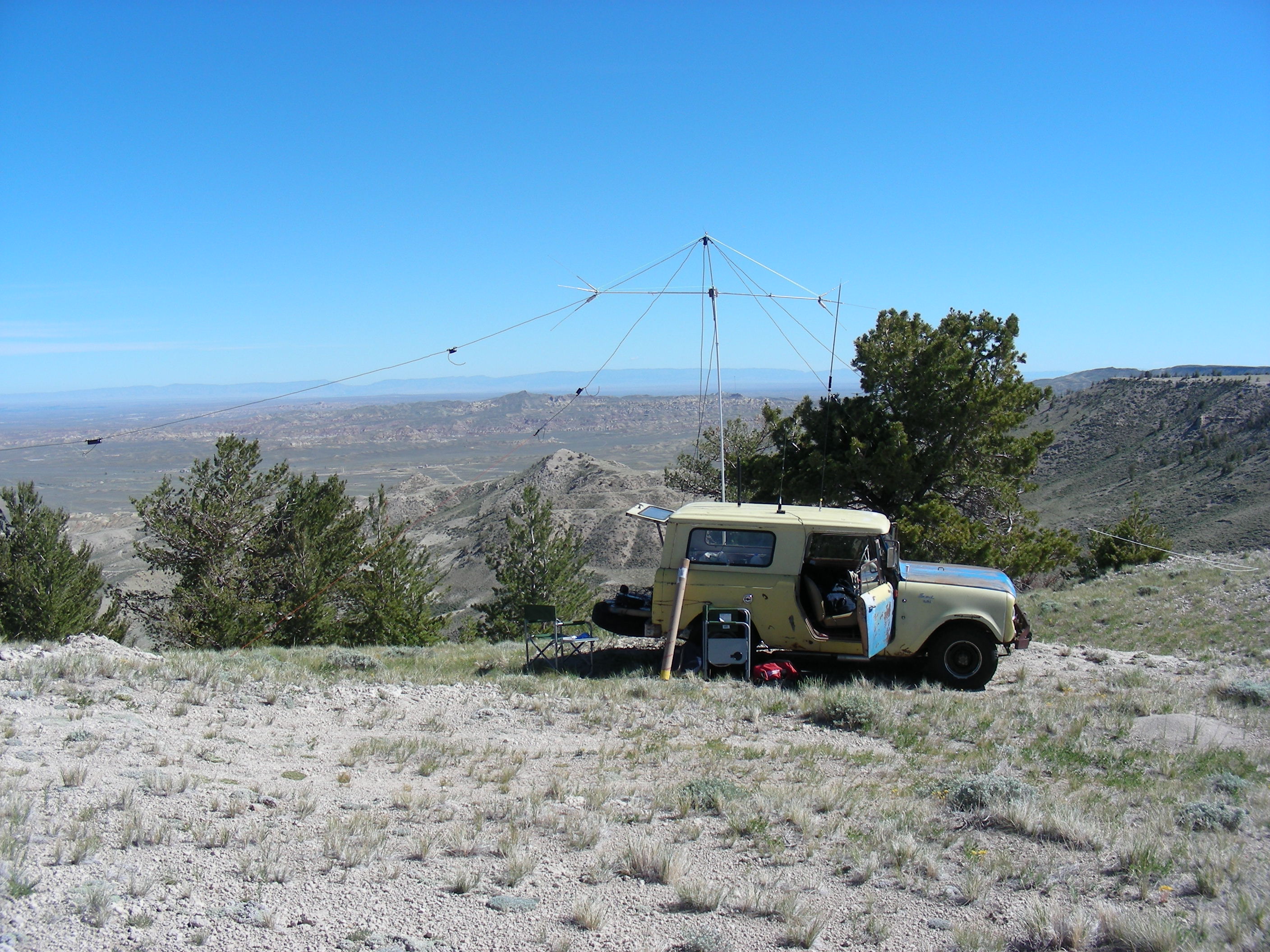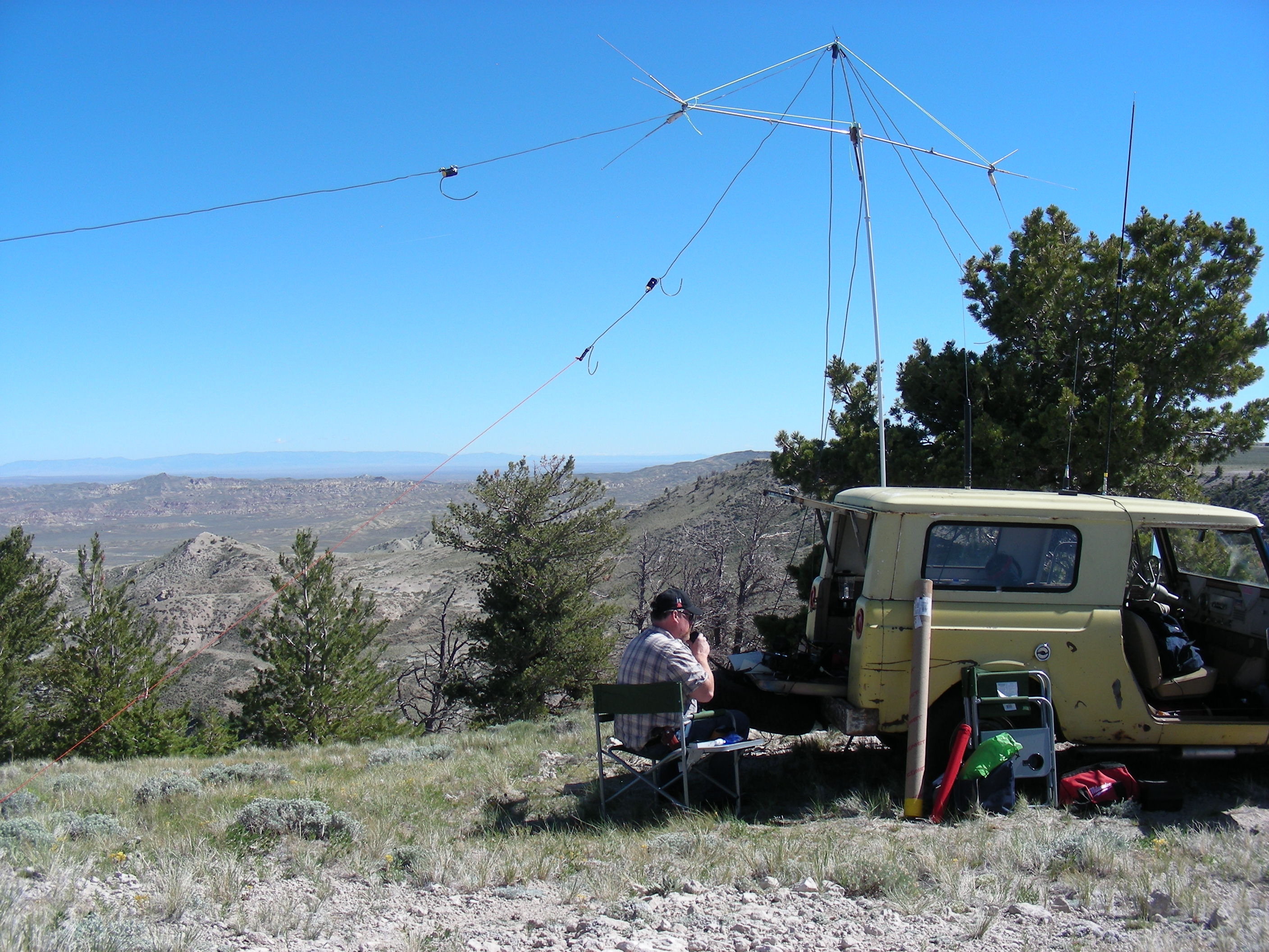 Here I am (photographer and subject) operating atop a 7000ft ridge in Wyoming during Field Day 2013. It took the old International Scout locked in 4WD-Low to get up there. I set up vertical and dipole antennas for 80M up to 6M and made contact on all bands (SSB). Camped overnight in the vehicle. A real tailgate operation!