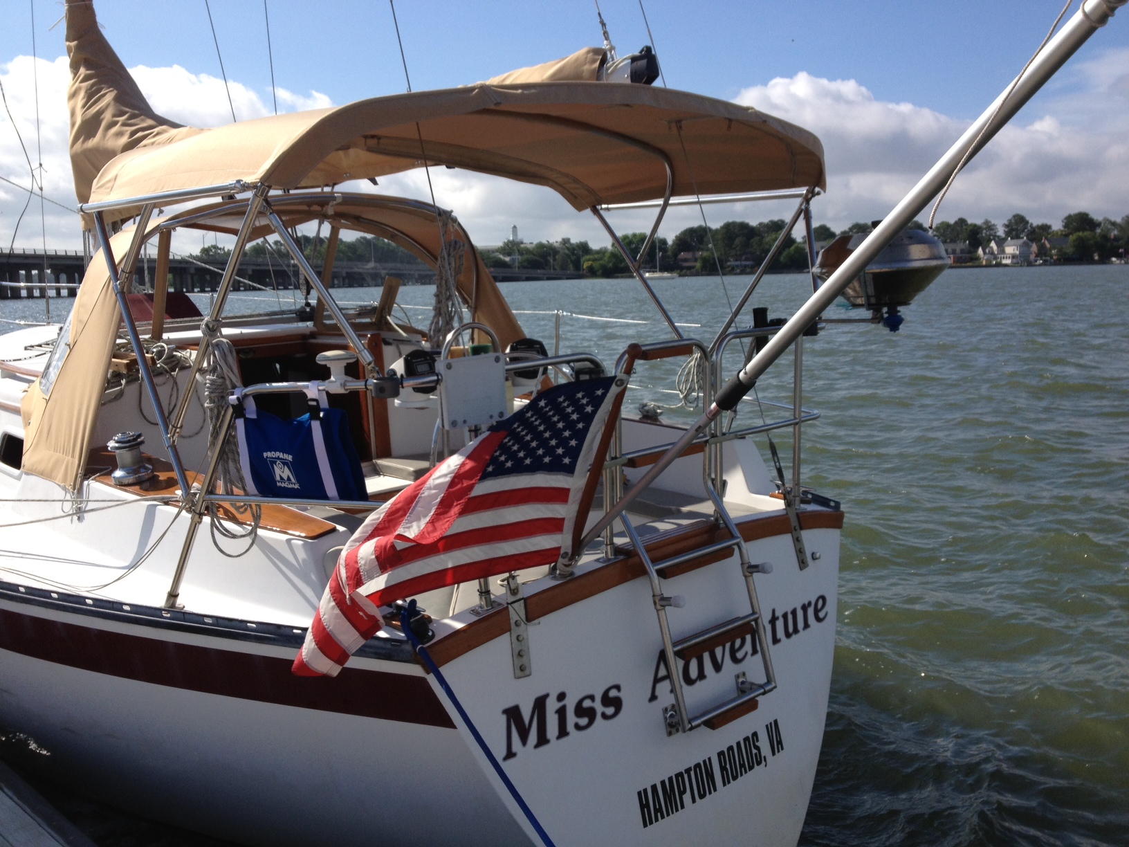 We sailed out of Hampton, VA, past the big ships at the Naval base at Norfolk, and eventually anchored in the Lafayette River overnight. We ate well, slept comfortably, and made contacts easily. The rig was Tom's K3, which makes nearly a complete station. All we needed besides the rig was a balun, paddles, a laptop, and cables. With the antenna behaving so well, the only issue with operating from the boat is power. Running QRP is not a problem, but the voltage would not hold up at 100W. We were only able to run 70W or less. Next time we will have to reduce the resistance between the battery and the rig.